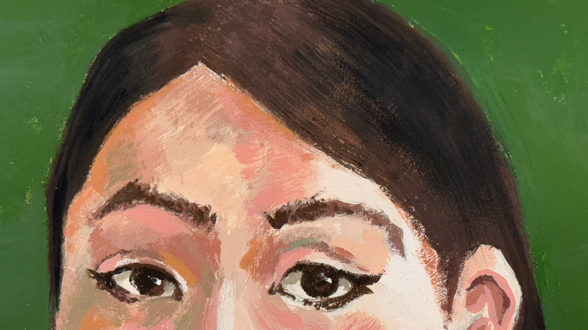 Portrait of a young woman over a Sap Green background.
